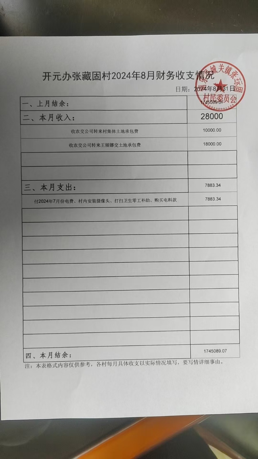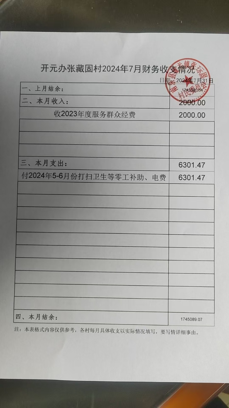 开元办张藏固村2024年7月-9月收支情况表